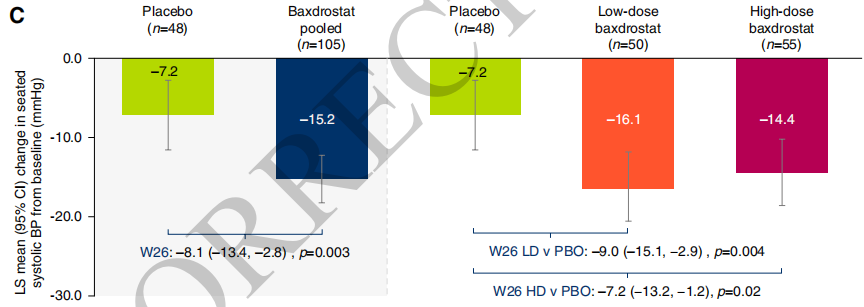 2、次要终点:LD组与安慰剂组的LS均差为-9.0 mmHg(P=0.004),HD组与安慰剂组的LS均差为-7.2 mmHg(-13.2~-1.2,P=0.02,图1)。