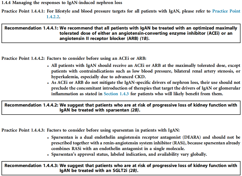 所有IgA肾病患者都应接受最大耐受剂量的ACEI或ARB,除非存在禁忌证,如低血压、双侧肾动脉狭窄或高钾血症,尤其是在CKD晚期。 由于ACEI或ARB并不能减轻IgA肾病肾小球丢失的特异性驱动因素,因此其使用不应妨碍同时引入针对IgA肾病或肾小球炎症驱动因素的治疗。
