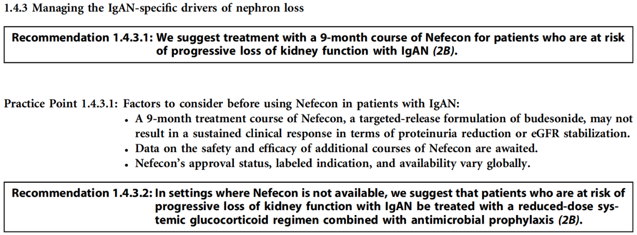当布地奈德肠溶胶囊不可及时,可以采用减量的全身糖皮质激素来减轻肾小球炎症,同时联合抗生素预防感染。需注意的是,对于eGFR<30 ml/(min·1.73 m²)、糖尿病和糖尿病前期、肥胖、潜伏感染(如病毒性肝炎和结核病)、活动性消化性溃疡、未控制的精神疾病、骨质疏松症、白内障的患者,使用全身糖皮质激素时,毒性风险增加。此外,全身糖皮质激素在指南推荐剂量下并未被证明能降低致病性IgA或IgA-IC水平。
