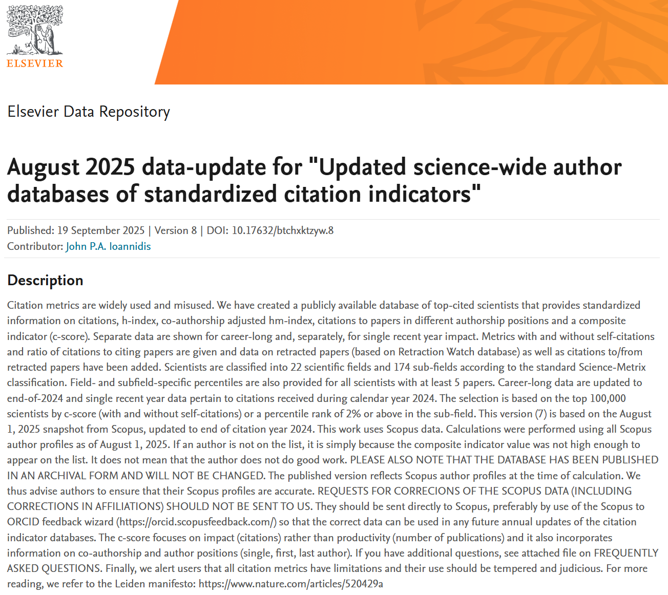 来源:August 2025 data-update for "Updated science-wide author databases of standardized citation indicators" - Elsevier BV