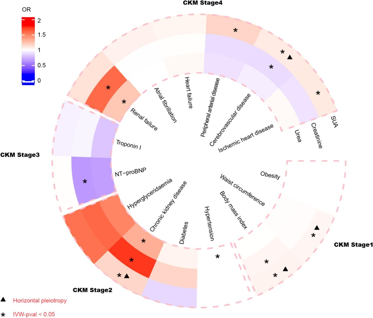 MR分析显示,SUA水平升高对CKM综合征的多个阶段均具有潜在风险效应,包括1期(体重指数[BMI],OR=1.049;腰围,OR=1.033)、2期(CKD,OR=1.169)和4期(脑血管疾病,OR=1.083;IHD,OR=1.090;PAD,OR=1.174)(图2)。