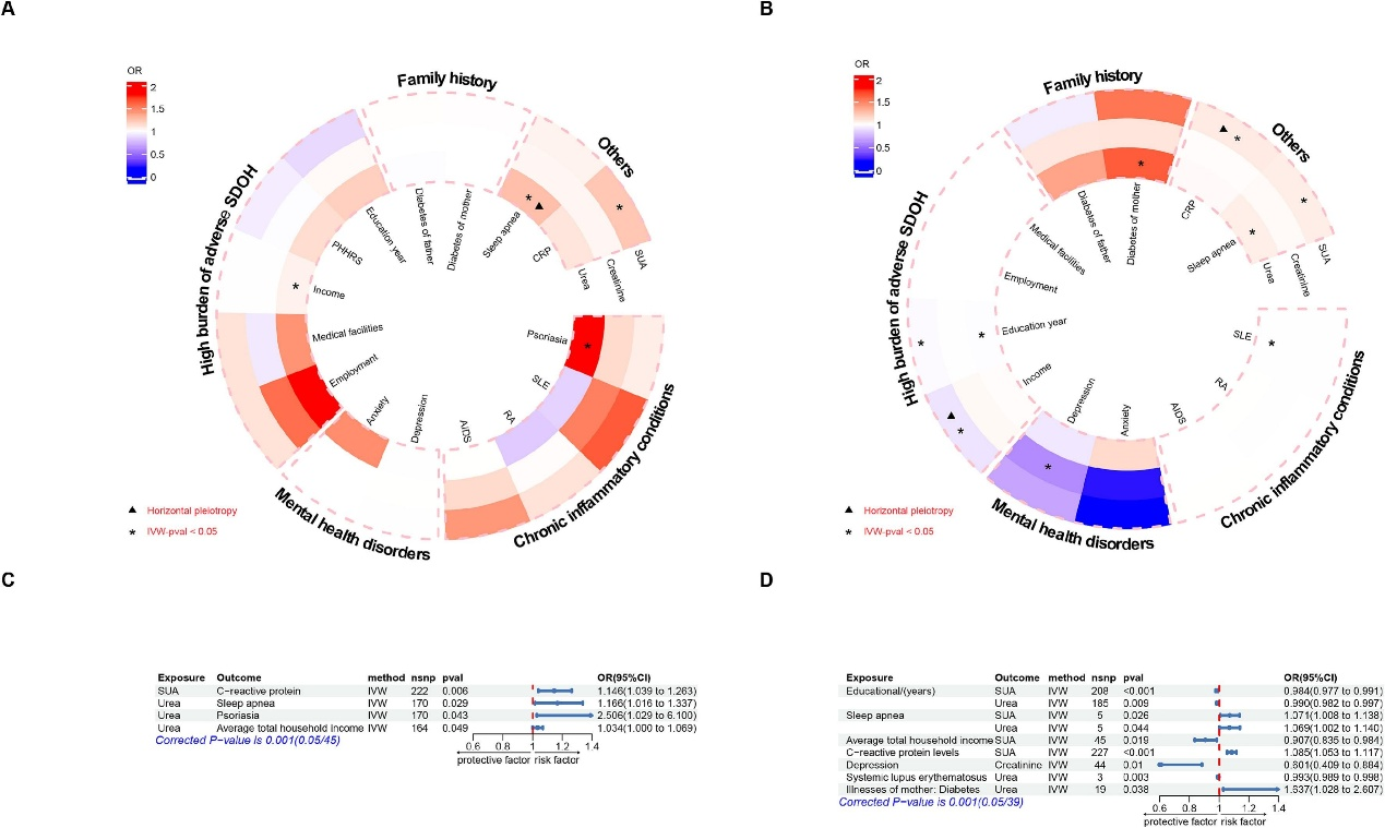在SUA和肾功能状态对风险因素的因果效应方面,SUA导致C反应蛋白(CRP)增加(OR=1.146),尿素是睡眠呼吸暂停(OR=1.166)和银屑病(OR=2.506)的风险因素(图4A、C)。