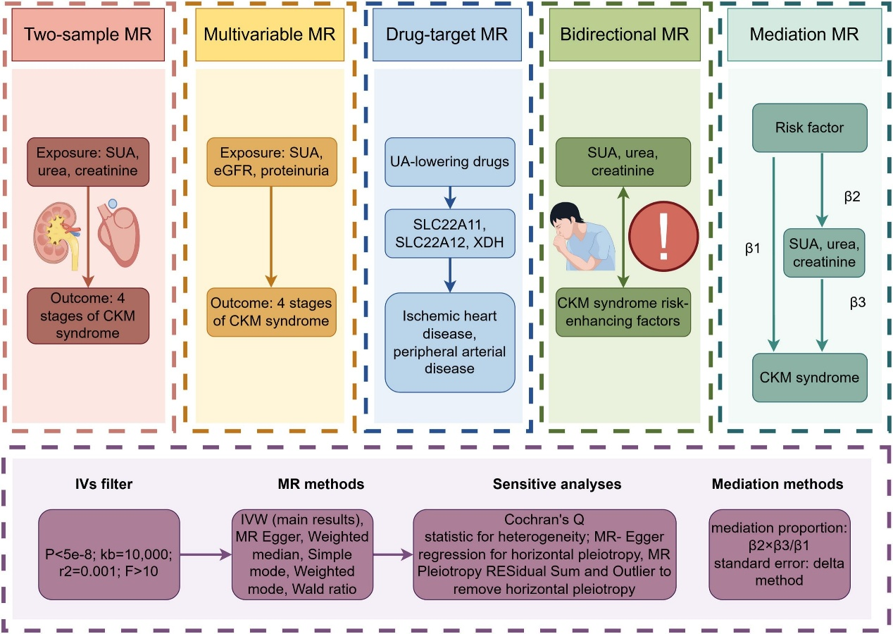 尿酸(UA)是嘌呤代谢的终产物,主要存在于血清和尿液中。虽然长期以来认为高尿酸血症与痛风、肾脏病及CVD相关,但其间的因果关系仍缺乏确凿证据。传统生物标志物,如肌酐和尿素虽能反映肾功能,但特异性有限。本研究通过MR分析,旨在探索SUA、肾功能与CKM综合征及其风险因素间的复杂因果关系,并探索潜在的药物靶点。