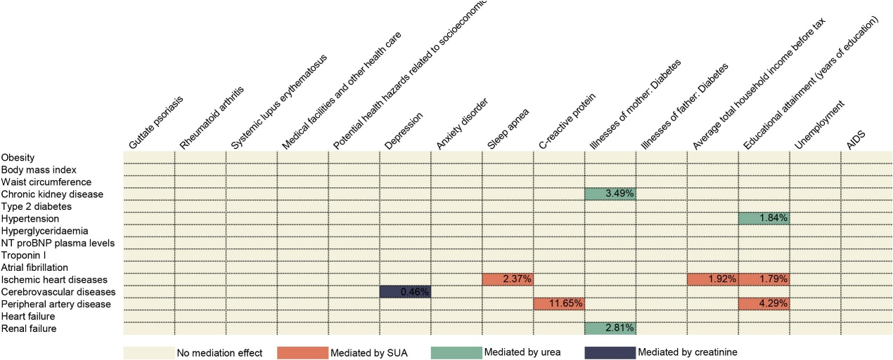 两步MR分析显示,SUA介导了以下因果关系:收入对IHD(1.92%),CPR对PAD(11.65%),教育水平对IHD(1.79%),教育水平对PAD(4.29%),睡眠呼吸暂停对IHD(2.37%);肌酐介导了抑郁对脑血管疾病(0.46%);尿素介导了母亲糖尿病对CKD(3.49%)、母亲糖尿病对肾衰竭(2.81%)和教育水平对高血压(1.84%)(图5)。