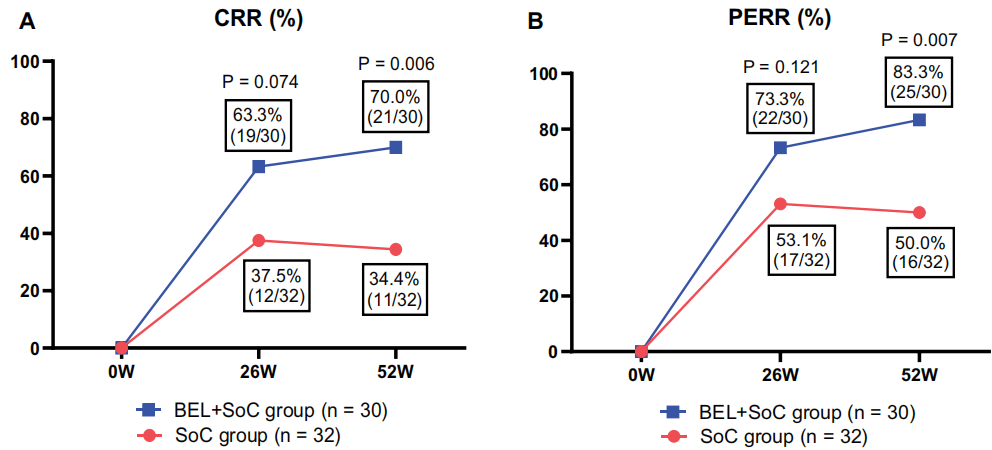 疗效比较贝利尤单抗的52周保留率为90.0%。贝利尤单抗+SoC组在52周时的CRR和PERR实现率显著高于SoC组(CRR:34.4% vs. 70.0%,P=0.006;PERR:50.0% vs. 83.3%,P=0.007,图1),。贝利尤单抗+SoC组在26周和52周时的uPCR显著低于SoC组(26周:1.8±2.8 vs. 0.5±0.7,P=0.013;52周:0.7±1.2 vs. 0.2±0.3,P=0.0007)。两组在26周和52周时的eGFR无显著差异。