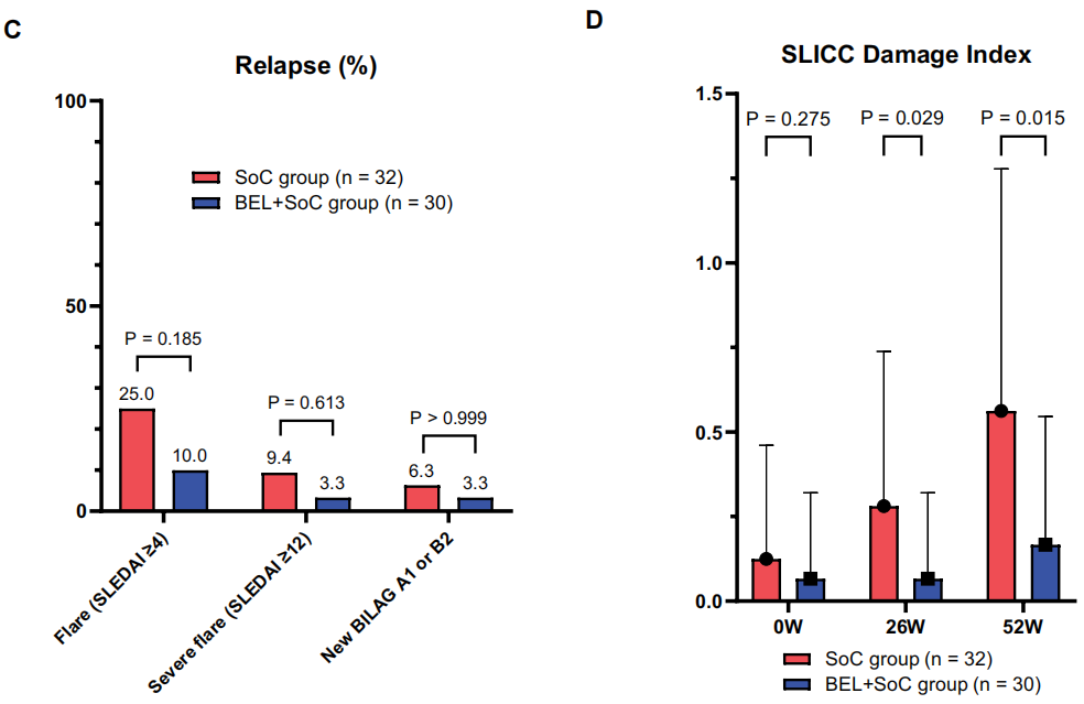 两组的复发率无显著差异。贝利尤单抗+SoC组在26周(0.3±0.5 vs. 0.1±0.3,P=0.029)和52周(0.6±0.7 vs. 0.2±0.4,P=0.0005)时的SDI显著低于SoC组(图3)。贝利尤单抗+SoC组的不良事件(CTCAE≥2级)和GC相关不良事件的发生率显著低于SoC组(不良事件:68.8% vs. 40.0%,P=0.040;GC相关不良事件:53.1% vs. 26.7%,P=0.042)。