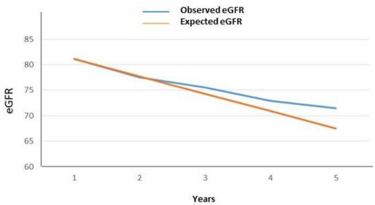 图1. 患者实际eGFR与预期eGFR随时间的变化