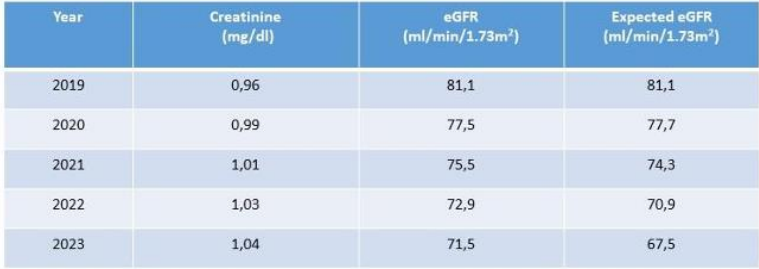 治疗4年后,血清肌酐为1.04 mg/dL,eGFR为71.5 mL/min/1.73m²(表 1)。估算eGFR年下降幅度约为2.4 ml/min/1.73m²,低于该特定患者类别未接受治疗时的预期下降幅度(每年- 3.4 ml/min/1.73m²)(图1),也低于治疗第一年观察到的下降幅度(3.6 ml/min/1.73m²)。