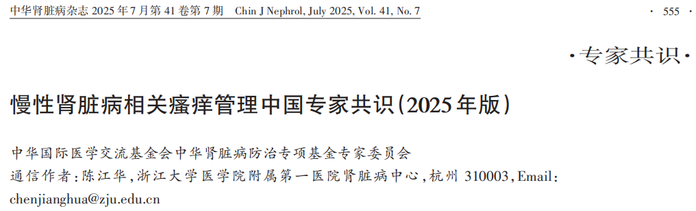 中华国际医学交流基金会中华肾脏病防治专项基金专家委员会. 慢性肾脏病相关瘙痒管理中国专家共识(2025年版). 中华肾脏病杂志. 2025; 41(7): 555-566.