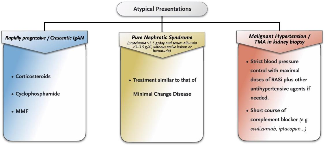 快速进展型/新月体性IgAN(RPIgAN):指eGFR在3个月内下降>50%,肾活检中>30%的肾小球出现新月体。观察性研究提示甲泼尼龙冲击联合口服泼尼松和环磷酰胺(口服或静脉)可能有效。对于虽不符合RPIgAN诊断标准但肾功能下降迅速者,糖皮质激素联合MMF亦有一定疗效。总体而言,RPIgAN预后较差,5年内>70%患者进展至ESKD。