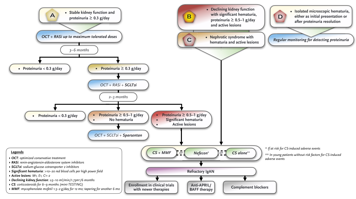 若3~6月后蛋白尿仍>0.3 g/d,建议加用SGLT2i。若仍蛋白尿明显,治疗选择依据是否伴持续性血尿而定:(1)若严重的蛋白尿持续存在但无明显血尿,建议加用司帕生坦,同时,停用RASi;(2)若有明显蛋白尿和血尿,尤其是肾活检发现存在活动性病变,推荐应用皮质类固醇 + MMF、耐赋康或激素单药治疗。