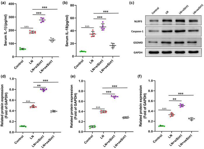 图6. Sirt1抑制肾小球系膜细胞(GMCs)中的NLRP3信号通路(a) 白细胞介素-1β(IL-1β)的水平;(b) 白细胞介素-18(IL-18)的水平;(c) NLRP3信号通路相关蛋白的表达;(d) NLRP3蛋白水平;(e) Caspase-1蛋白水平;(f) GSDMD(气体皮质样蛋白D)蛋白水平。与对照组比较,ΔΔΔ 表示 P < 0.001;与LN组比较,**表示 P < 0.01,***表示 P < 0.001。GMCs:人肾小球系膜细胞。