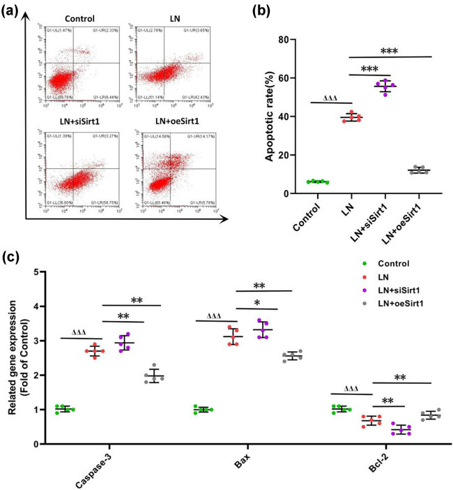 图4. Sirt1抑制肾小球系膜细胞(GMCs)的凋亡(a) GMCs的凋亡情况;(b) GMCs的凋亡率;(c) 凋亡相关基因的表达情况。与对照组相比,ΔΔΔ 表示 P < 0.001;与LN组相比,*表示 P < 0.05,**表示 P < 0.01,***表示 P < 0.001。GMCs:人肾小球系膜细胞。