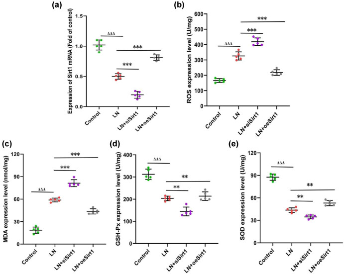 图3. Sirt1抑制肾小球系膜细胞(GMCs)中的氧化应激(a) 不同实验组中Sirt1的表达;(b) GMCs中活性氧(ROS)的水平;(c) 丙二醛(MDA)的水平;(d) 谷胱甘肽过氧化物酶(GSH-Px)的水平;(e) 超氧化物歧化酶(SOD)的水平。与对照组相比,ΔΔΔ 表示 P < 0.001;与LN组相比,**表示 P < 0.01,***表示 P < 0.001。GMCs:人肾小球系膜细胞;ROS:活性氧;MDA:丙二醛;GSH-Px:谷胱甘肽过氧化物酶;SOD:超氧化物歧化酶。