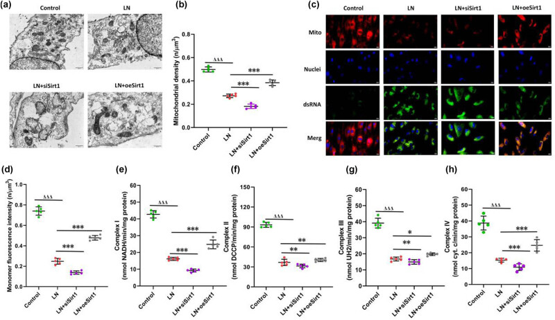 图5. Sirt1保护肾小球系膜细胞(GMCs)的线粒体功能(a) 线粒体形态的观察;(b) 线粒体密度的变化;(c) 线粒体膜电位的变化;(d) 线粒体膜电位的定量变化;(e) 线粒体复合酶I的变化;(f) 线粒体复合酶Ⅱ的变化;(g) 线粒体复合酶Ⅲ的变化;(h) 线粒体复合酶Ⅳ的变化。与对照组比较,ΔΔΔ 表示 P < 0.001;与LN组比较,*表示 P < 0.05,**表示 P < 0.01,***表示 P < 0.001。GMCs:人肾小球系膜细胞。