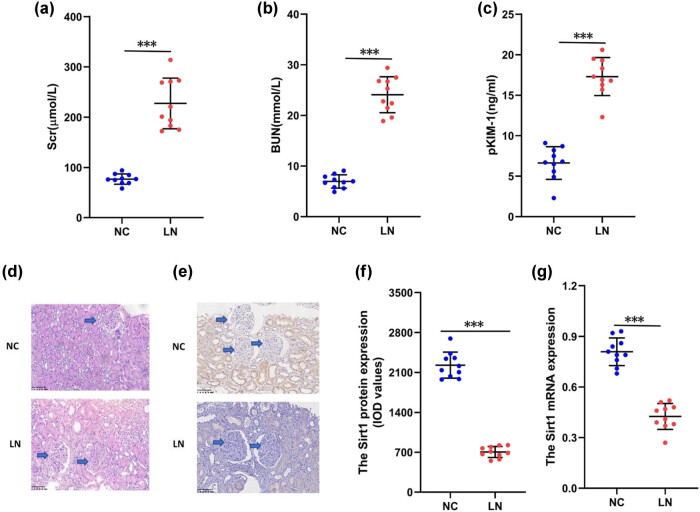 图2. LN患者肾组织中Sirt1的表达(a)血清肌酐(Scr)水平;(b)血尿素氮(BUN)水平;(c)血浆肾损伤分子-1(pKIM-1)水平;(d)肾脏病理(×400);(e)Sirt1蛋白表达(×400);(f)Sirt1蛋白水平;(g)Sirt1 mRNA-表达。与LN组相比,*P<0.05,**P<0.01,***P<0.001。Sirt1:sirtuin1;Scr:血清肌酐;BUN:血尿素氮;pKIM-1:血浆肾损伤分子-1。