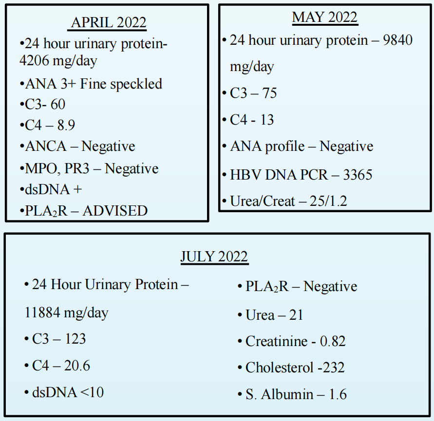 约11个月前,患者患疟疾,伴少尿,血清肌酐4.3 mg/dl,曾接受1单位输血及3次血液透析,随后完全恢复,血清肌酐及尿量均正常。之后,于2021年12月体检时偶然发现HBsAg阳性,HBV DNA载量高,开始口服替诺福韦酯(Tenofovir Disoproxil Fumarate,300 mg,每日一次)。2022年2月门诊复查时,患者主诉双下肢水肿、泡沫尿数日。检测结果:尿素19.4 mg/dl,肌酐0.82 mg/dl,尿试纸蛋白3+,红细胞阴性,HBV DNA 28 957 IU/ml。三次随访检查结果见图1。