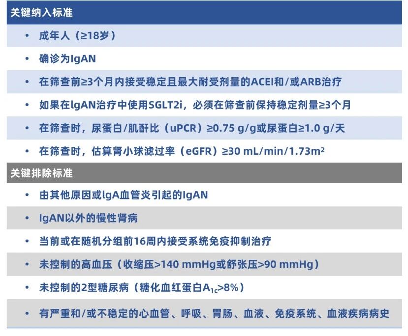 VISIONARY是一项3期、多中心、双盲、随机、安慰剂对照试验(NCT05248646),纳入经活检确诊的IgAN成人患者,其正在接受稳定且最大耐受剂量的肾素-血管紧张素系统抑制剂(RASi)基础治疗,同时可能还使用钠-葡萄糖协同转运蛋白2抑制剂(SGLT2i)的治疗。符合条件的受试者被1:1随机分配每4周一次接受400mg斯贝利单抗SC或安慰剂SC治疗,共26次给药。该预先指定的中期分析的主要终点是与基线相比,9个月时24小时尿蛋白/肌酐比值(uPCR-24h)的变化,该分析计划在320名随机分配的受试者完成9个月uPCR-24h评估后进行[8]。关键纳入和排除标准见表1[2]。