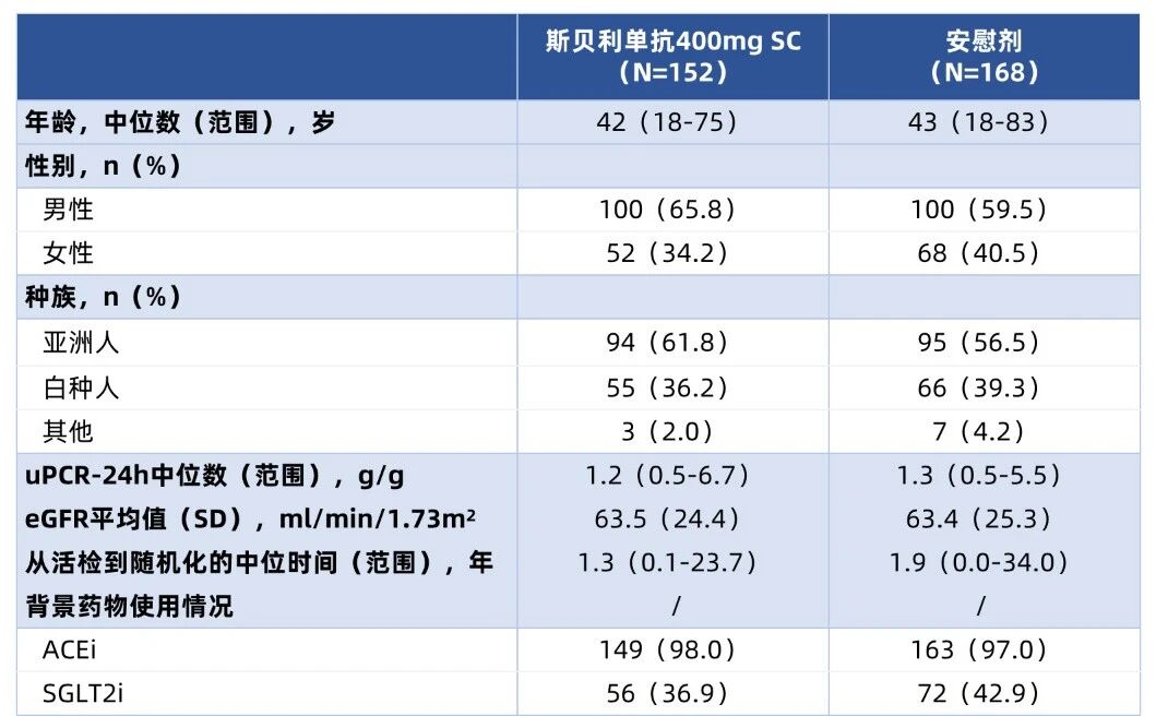 在31个国家中,共有510名受试者符合纳入标准并被随机分配。其中320名完成了9个月uPCR-24h评估的受试者(斯贝利单抗组152名,安慰剂组168名)被纳入这项中期分析。在这些受试者中,63%为男性,59%为亚洲人,中位年龄为42岁(范围为18-83岁)。基线时,斯贝利单抗组分别有98%和36.9%的受试者报告使用RASi和SGLT2i治疗,中位(范围)uPCR-24h为1.2g/g(0.5-6.7),平均(SD)eGFR为63.5(24.4)ml/min/1.73m²(表2)。
