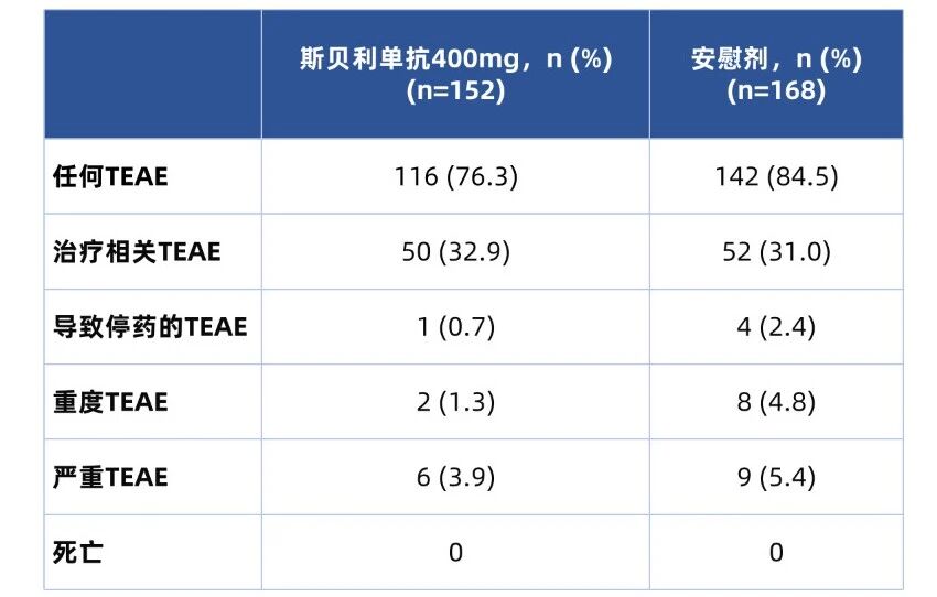 斯贝利单抗组治疗期间出现的任何不良事件(TEAEs)的受试者比例为76.3%,而安慰剂组为84.5%,无死亡事件报告。斯贝利单抗组和安慰剂组严重TEAEs的发生率分别为3.9%和5.4%。斯贝利单抗组和安慰剂组分别有1名和4名受试者因TEAE而停药(表3)。