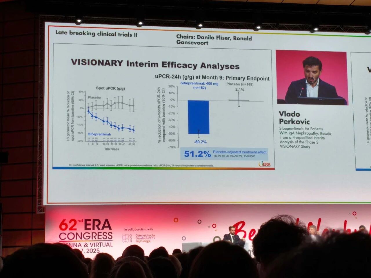 VISIONARY研究是迄今为止规模最大的Ⅲ期IgAN试验,在预先指定的中期分析中,已达到主要研究终点。与安慰剂相比,靶向APRIL抑制剂斯贝利单抗在治疗9个月后显著且稳健地降低了蛋白尿水平,并且具有良好的安全性。由于蛋白尿是预测IgAN长期预后的一个重要独立指标,因此这种程度的蛋白尿降低可能预示着具有临床意义的肾功能的改善,将在后续的试验中进行正式评估。