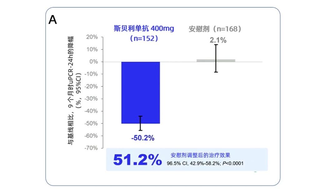 治疗9个月后,斯贝利单抗组的uPCR-24h相较于基线降低50.2%,安慰剂组的uPCR-24h相较于基线升高2.1%;与安慰剂组相比,斯贝利单抗组的uPCR-24h显著降低51.2%(P<0.0001)(图1A)。