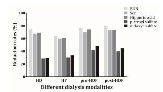 图2. 不同透析模式对尿毒症毒素的清除能力
