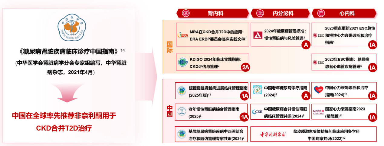 图4. 国外指南推荐非奈利酮是改善T2DM相关CKD患者心肾结局的一线标准治疗药物