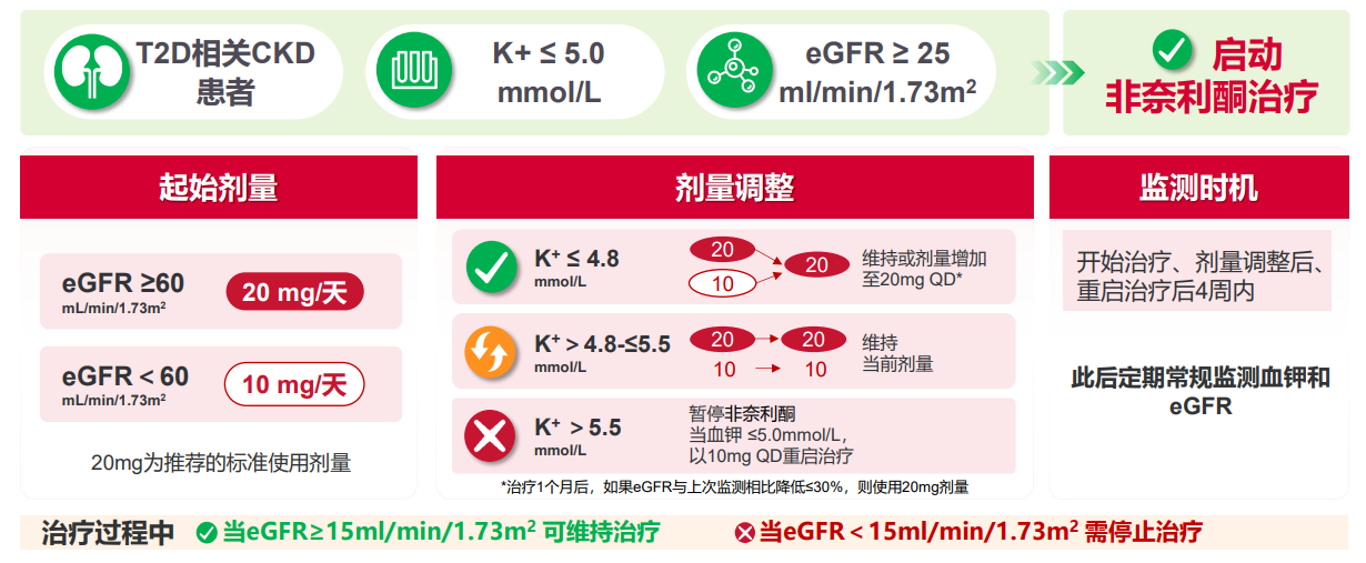 作为T2DM相关CKD治疗的一线标准药物,早期起始,足量足程使用是实现非奈利酮最大化临床价值的基础。非奈利酮标准剂量为20 mg,每日1次,基于血清钾水平进行剂量调整: