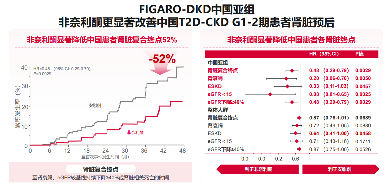 中国患者伴有更高的蛋白尿水平,意味着面临更高的肾心疾病进展风险,而FIGARO-DKD中国亚组显示,非奈利酮更显著降低中国T2DM相关CKD G1-2期患者肾脏复合终点达52%(图3),有效延缓eGFR下降,显著降低UACR达39%且在治疗期间作用持续[14],在疾病的早期阶段展现出更加显著的肾脏保护作用。