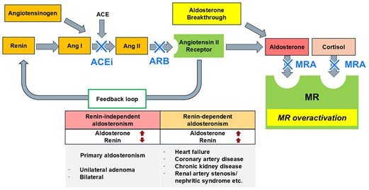 需要注意的是,虽然血管紧张素转换酶抑制剂(ACEi)或血管紧张素受体拮抗剂(ARB)可以抑制醛固酮(图1),但长期(>6个月)应用后醛固酮往往出现“反弹”,即醛固酮逃逸,提示仅阻断上游RAS不足以改善患者预后。