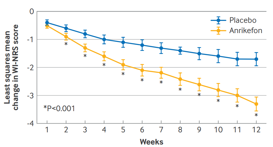 研究结果显示:主要疗效指标双盲治疗期第12周WI-NRS(每日最严重瘙痒强度数字评分NRS)的周平均值较基线改善≥4分的受试者比例,安瑞克芬组显著高于安慰剂组(P<0.001),表明安瑞克芬的疗效显著优于安慰剂。
