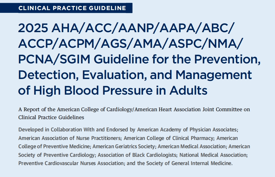 Jones et al. 2025 AHA /ACC /AANP /AAPA /ABC /ACCP /ACPM/AGS/AMA/ASPC/NMA/ PCNA/SGIM Guideline for the Prevention, Detection, Evaluation, and Management of High Blood Pressure in Adults. JACC.