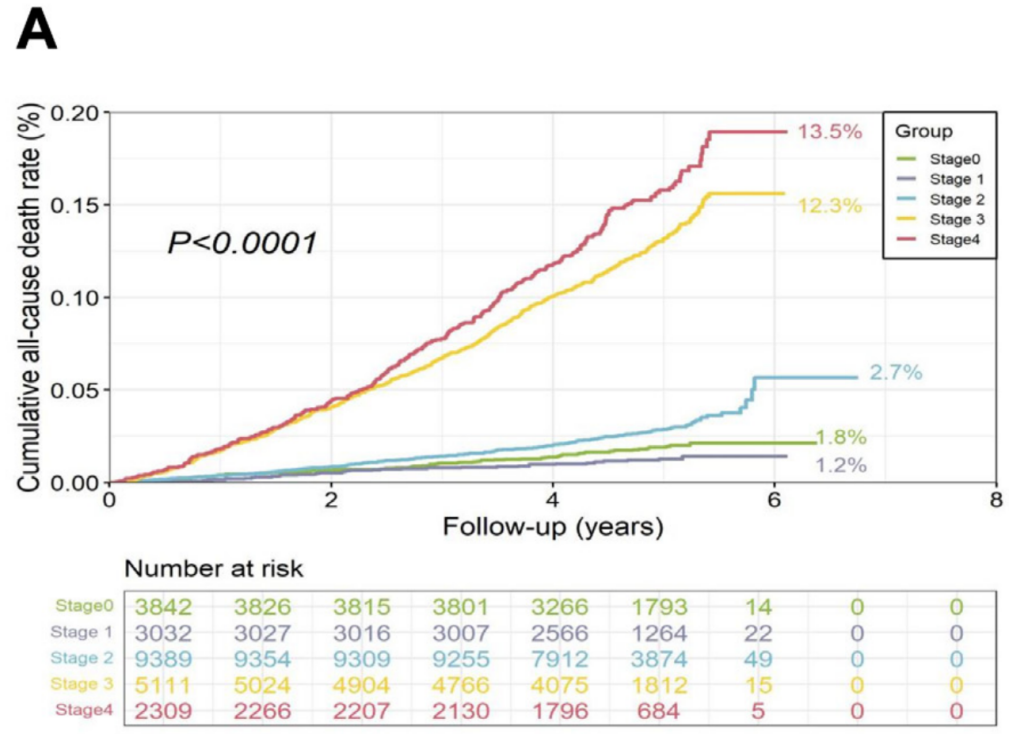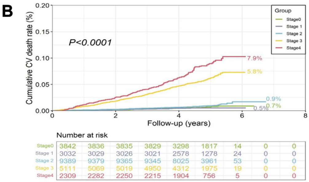 心血管死亡: 经多因素调整后HR从2期的1.16(不显著)上升至4期的4.87。