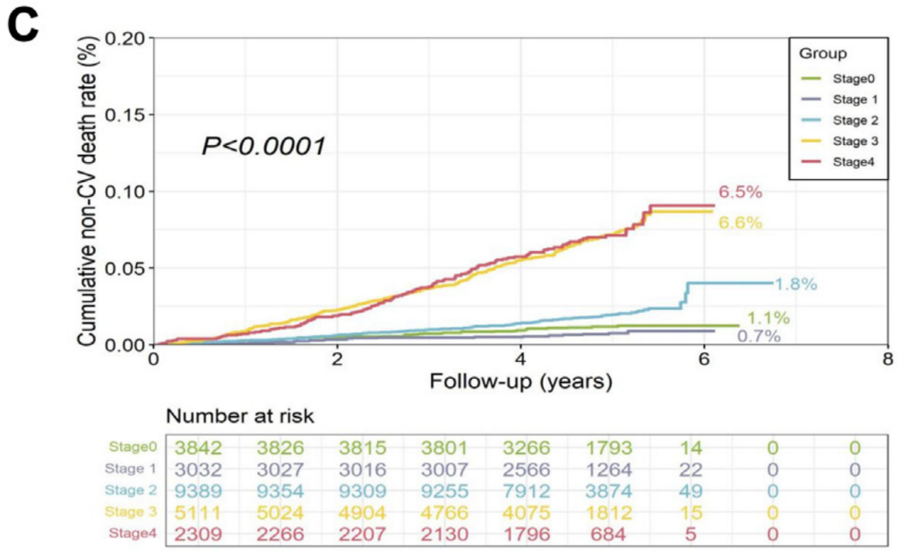 图1. 全因死亡(图A)、心血管(CV)死亡(图B)和非心血管死亡(图C)的5年累积率在各CKM分期中存在显著差异