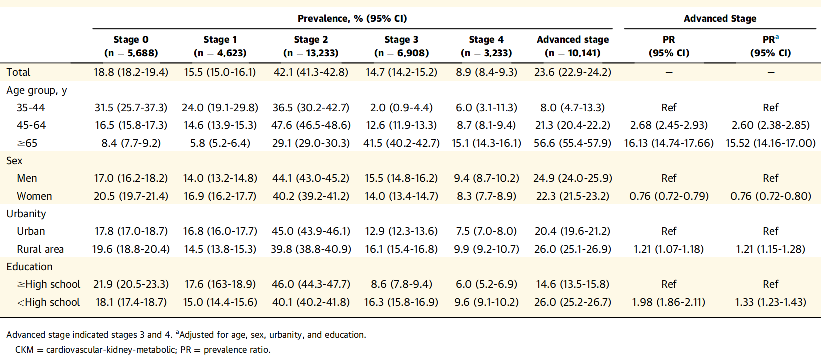 年龄差异: CKM晚期患病率随年龄急剧上升,35-44岁人群为8.0%,45-64岁人群为21.3%,≥65岁人群高达56.6%。在35~44岁和45~64岁人群中,2期CKM最为常见(36.5%);而在≥65岁人群中,3期最为常见(41.5%)。