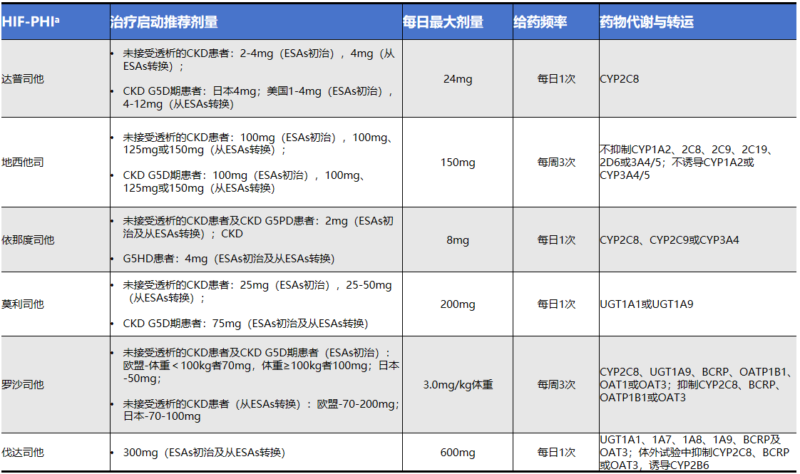 注:BCRP:乳腺癌耐药蛋白(三磷酸腺苷结合盒转运蛋白家族成员);CKD G5D:CKD G5期接受透析;CKD G5HD:CKDG5期接受血液透析;CKD G5PD:CKD G5期接受腹膜透析;CYP:细胞色素P450;OAT:有机离子转运体;UGT:尿苷5'-二磷酸葡萄糖醛酸转移酶。a各HIF-PHI在特定患者人群中的获批情况因国家而异,药物相互作用的详细信息请参考药品说明书及监管机构发布的产品资料。本表格基于2024年初可用信息,说明书内容可能会更新。所有HIF-PHI均合理采用低起始剂量。