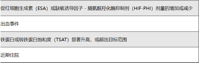 实践要点2.6:对于接受铁剂治疗的CKD患者,出现以下情况时应增加铁相关指标检测频率(表5):启动或增加ESAs或HIF-PHIs剂量;已知存在失血事件;近期住院;铁蛋白或TSAT显著升高或超出目标范围。