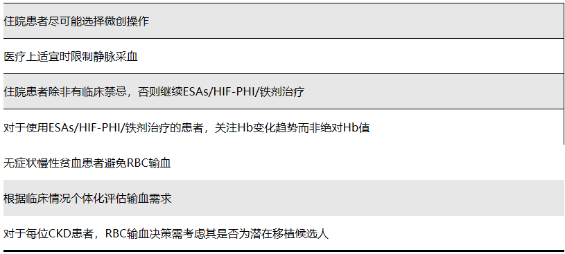 实践要点4.2:对于有器官移植资格的贫血合并CKD患者,应尽可能避免RBC输血,以降低同种致敏风险。