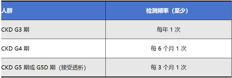 注:建议的检测间隔为血红蛋白水平的最低检测频率。对于使用ESAs或HIF-PHIs的患者、血红蛋白水平低于目标范围的患者或CKD快速进展的患者,建议提高检测频率。