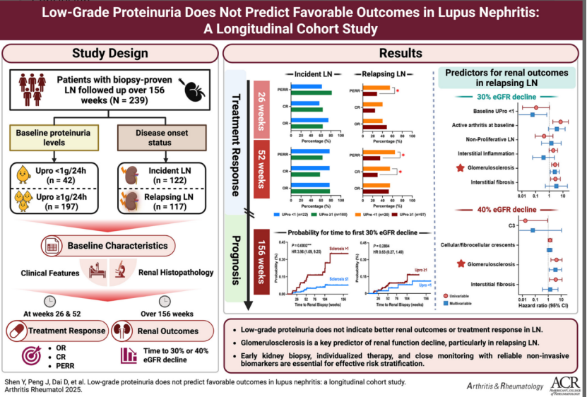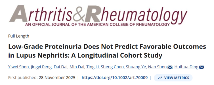 Yiwei Shen, et al. Low-Grade Proteinuria Does Not Predict Favorable Outcomes in Lupus Nephritis: A Longitudinal Cohort Study. Arthritis Rheumatol. 2025 Nov 28. doi: 10.1002/art.70009. Online ahead of print.