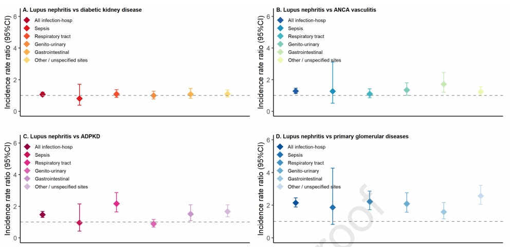 图1.与其他病因CKD患者相比,LN-CKD全因住院及特定部位感染发生率的比值