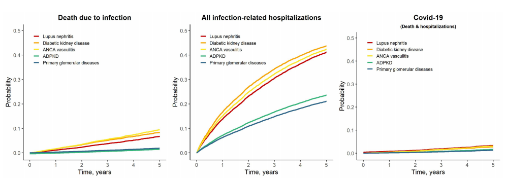 图2. 不同病因CKD患者感染相关的死亡、感染相关的住院和COVID-19发生的风险