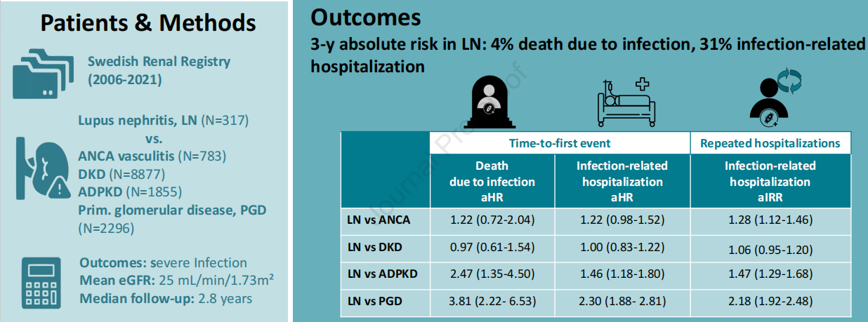 该研究为全国队列研究,数据来源于2006-2021年瑞典肾脏登记处(SRR-CKD)。该研究纳入14128例CKD患者,其中LN-CKD患者317例,对照组包括抗中性粒细胞胞浆抗体(ANCA)血管炎相关CKD患者783例、糖尿病肾病(DKD)患者8877例、常染色体显性多囊肾病(ADPKD)患者1855例以及原发性肾小球疾病(PGD)患者2296例,中位随访时间2.8年,重点评估了感染相关住院和感染相关死亡等结局。