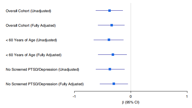 敏感性分析中,倾向评分匹配后,认知障碍患者eGFR年均下降率仍显著高于无认知障碍者(-1.9 vs. -1.1 ml/min/1.73m2,P=0.009);排除60岁以上人群、排除PTSD/抑郁症患者后,认知障碍与eGFR快速下降的关联依然存在(P均<0.05)。