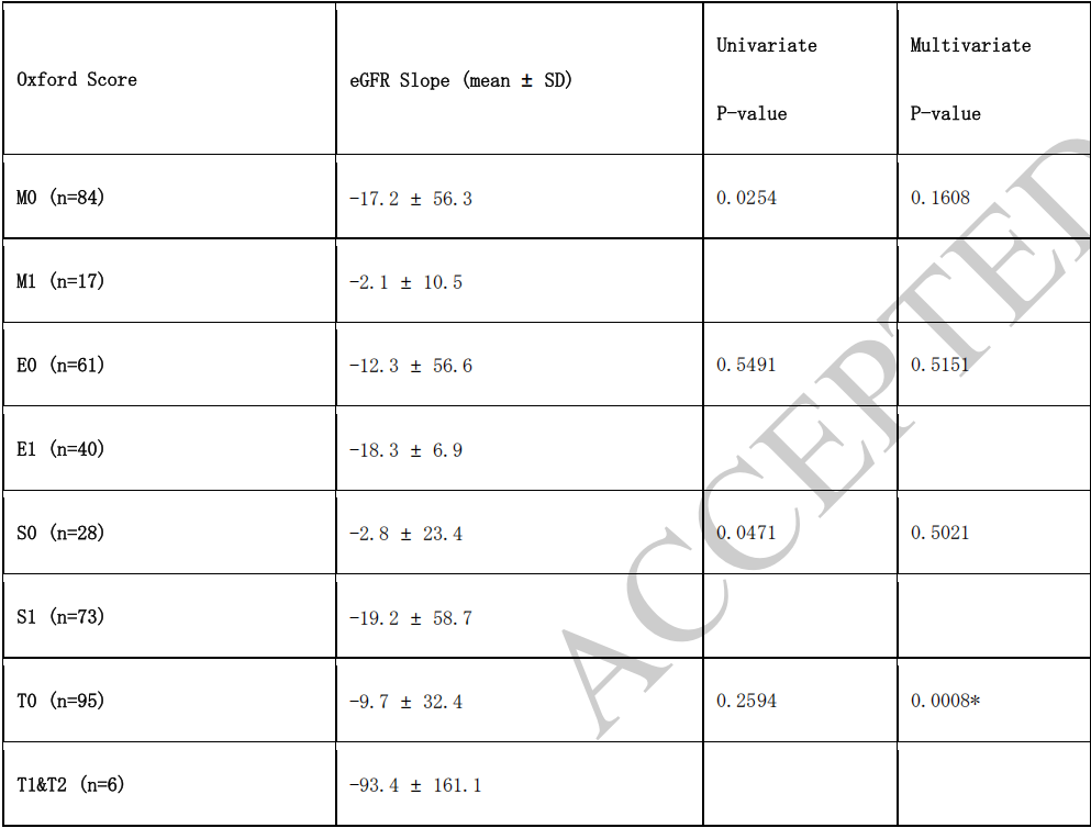 表1. 牛津MEST-C评分与治疗前eGFR斜率的相关性
