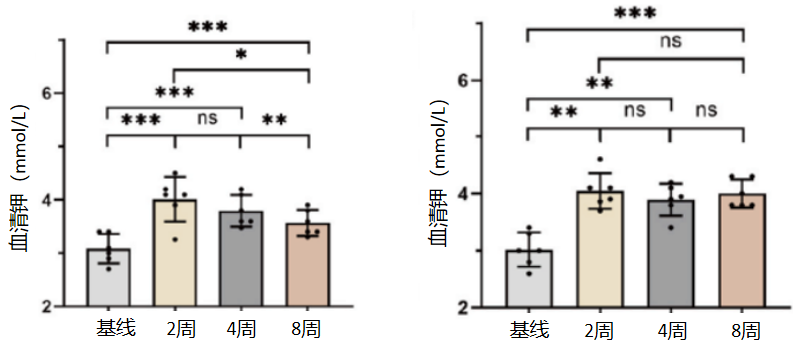 按CKD状态分层分析显示,无论是否合并CKD,患者血清钾水平均较基线显著升高(P<0.05);其中无CKD患者8周时血清钾水平显著低于2周、4周(P<0.05),提示无CKD患者可能需要更密切的血钾监测及剂量调整(图3)。