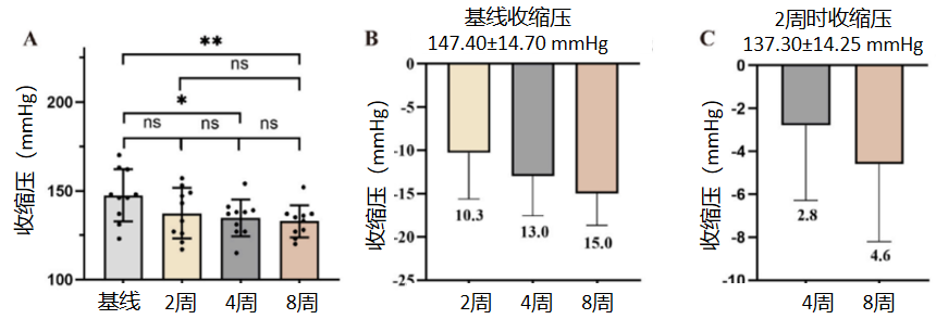 15例患者中,10例在治疗期间未增加降压药物种类或减少剂量(2例减少降压药剂量,8例维持原有剂量)。对该部分患者的血压分析显示,SBP在治疗4周、8周时较基线显著下降(P<0.05,图4A),平均降幅分别为13.0 mmHg、15.0 mmHg;2周时SBP较基线下降10.3 mmHg,但差异无统计学意义(P>0.05,图4B)。与2周时相比,4周、8周时SBP进一步下降,平均降幅分别为2.8 mmHg、4.6 mmHg(图4C)。DBP在治疗各时间点与基线相比均无显著变化。