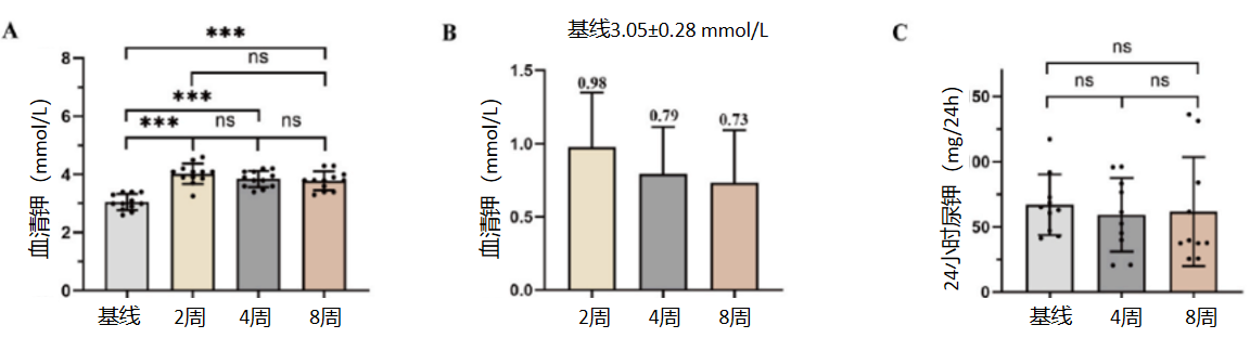 (三)次要终点治疗期间,血清钾水平呈现显著变化:2周、4周、8周时血清钾水平均较基线显著升高(P<0.05,图2A),平均升高幅度分别为0.98 mmol/L、0.79 mmol/L、0.73 mmol/L(图2B)。血清钾水平在2周时达到峰值,之后略有下降但无统计学意义。随访期间24小时尿钾与基线相比无显著变化(图2C)。