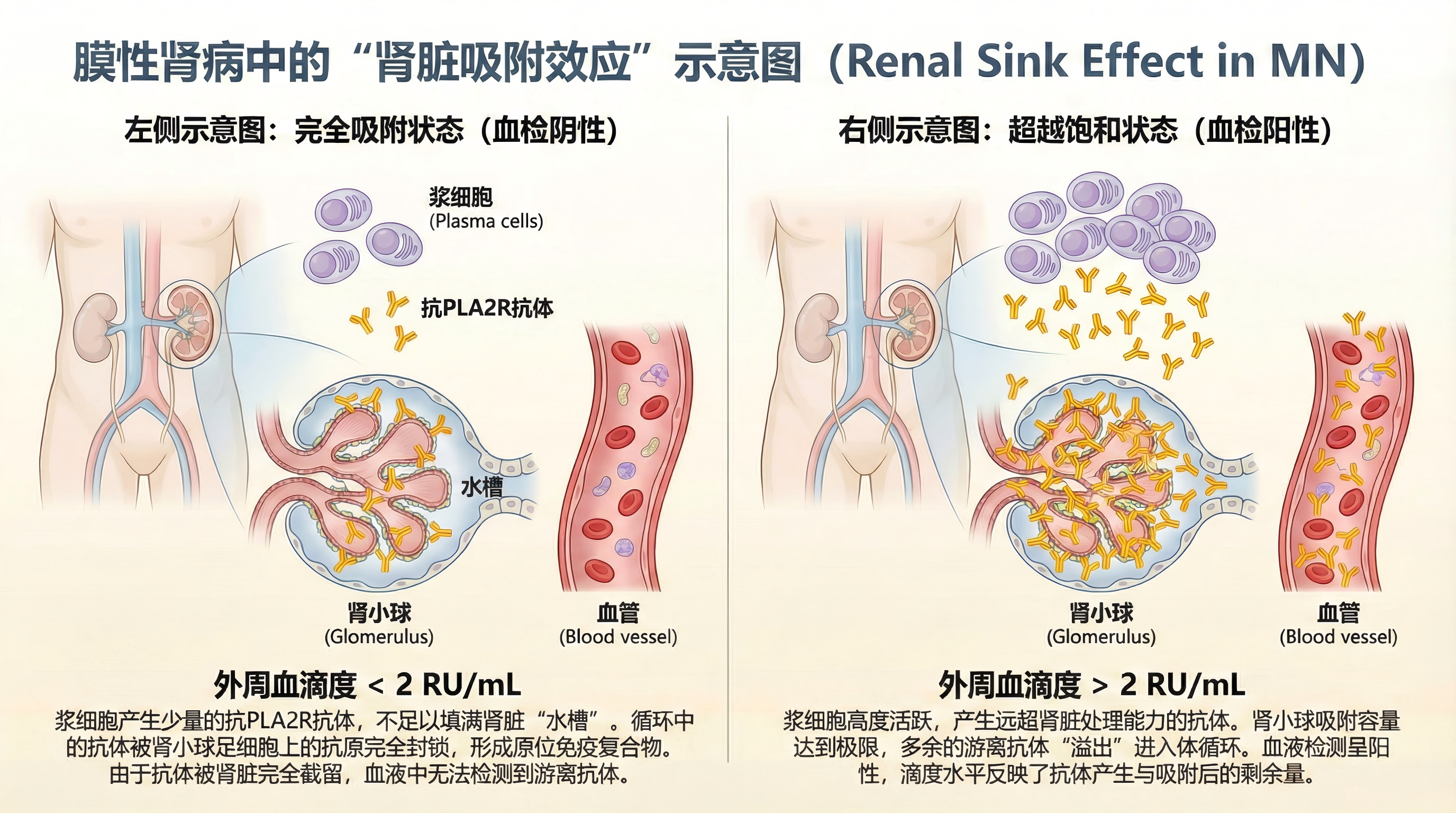 治疗目标:中高危患者应当以免疫学完全缓解为目标(< 2 RU/mL)随着对抗体致病性的确证及“肾脏吸附(Renal Sink)”效应的深入理解(图1),临床对于中高危PLA2R相关MN患者的治疗目标进行了重新评估。目前的观点倾向于将免疫学缓解的阈值设定为抗PLA2R抗体滴度 < 2 RU/mL(即完全不可测),而非传统检测试剂盒界定的< 14 RU/mL或< 20 RU/mL。这一建议基于PLA2R抗体本身具有致病性以及以下临床证据:
